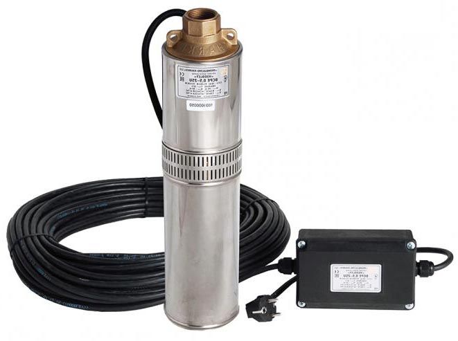Насос оборудован электрокабелем и конденсаторным блоком. Провод выходит из двигателя и проходит вдоль насоса сбоку, под защитной планкой. Верхняя часть насоса имеет резьбовой патрубок без встроенного обратного клапана и две проушины для крепления страховочного троса.